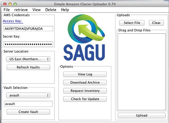 SAGUSimple Amazon Glacier Uploaded (SAGU) works in a similar manner to Fast Glacier, earning the “simple” in its name by delivering full upload/download, vault creation and management, and region selection in a single window. Once you’ve provided your AWS login credentials, there’s no additional configuration required. There’s not even any file installation required after you’ve downloaded the file, which comes available in .jar format. Files can be accessed and uploaded or retrieved using traditional “select file” or drag and drop. Inventory of uploaded files can also be performed with a single button.
